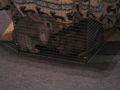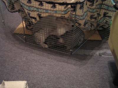 鹿柄の毛布に避難。